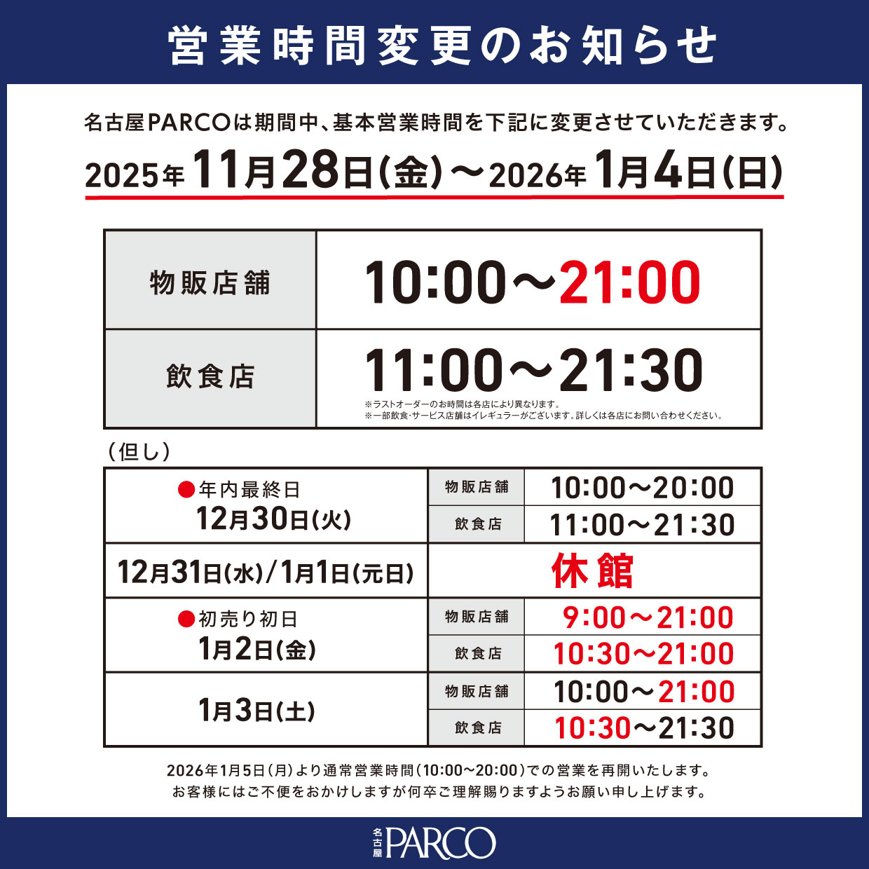 名古屋PARCO在以下期间,将更改基本营业时间。
